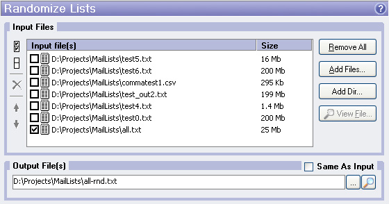 The output file will contain all lines from the input files in random order. You can turn on Same As Input option to randomize input files without jumbling them together.