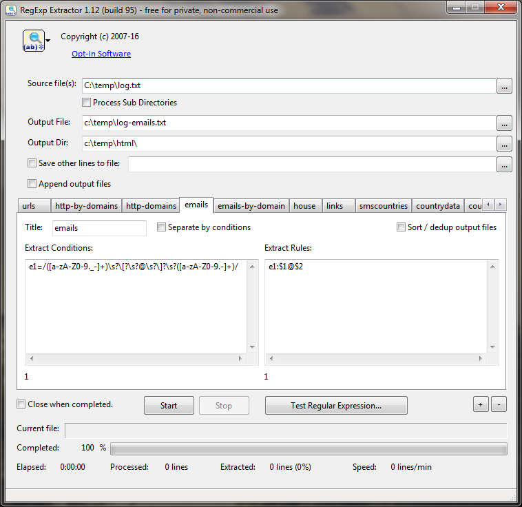 When you press "Start" button, RegExp Extractor will extract data from source file(s) using conditions and rules from the active tab.