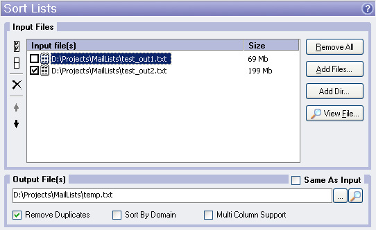 Specifies resultant output file. You can turn on Same As Input option if you don't want to combine all input files together, only sort them.