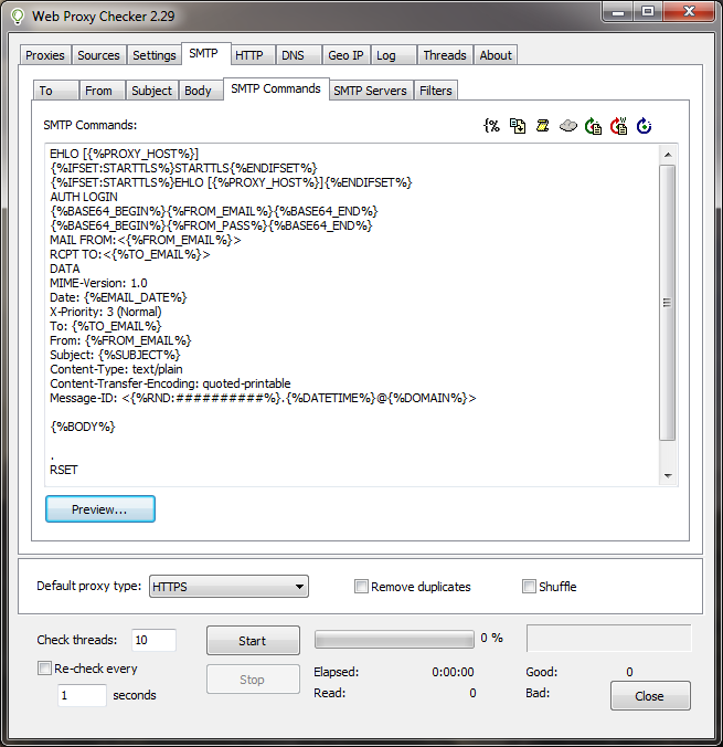 Web Proxy Checker supports message tags that allows you to customize and randomize message fields, body and SMTP commands.